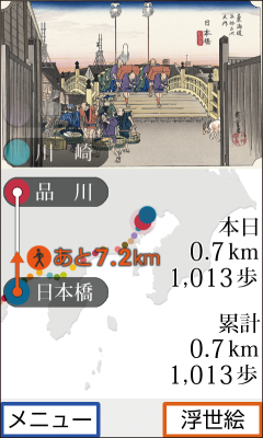 > Depending on the number of steps you take, the wallpaper changes to each scene from Hiroshige Utagawa's ukiyo-e print "The Fifty-Three Stations of the Tokaido'', so you can enjoy walking every day.