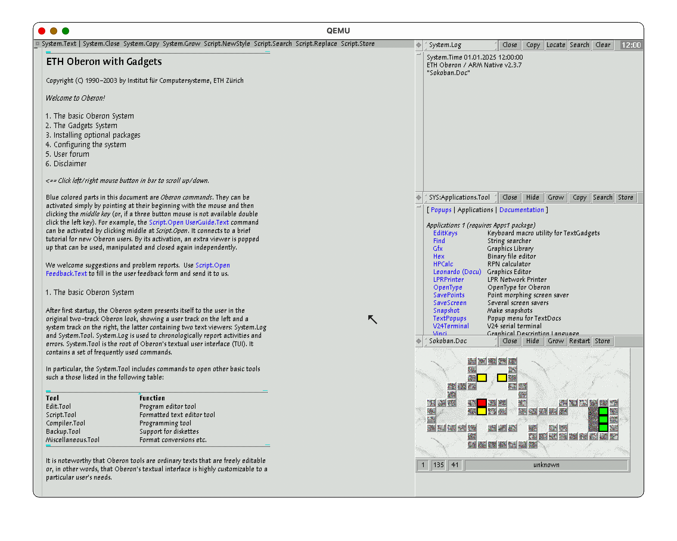 A screenshot of QEMU running in MacOS. The emulated graphical system is ETH Oberon 3 with Gadgets, running ARM Native port