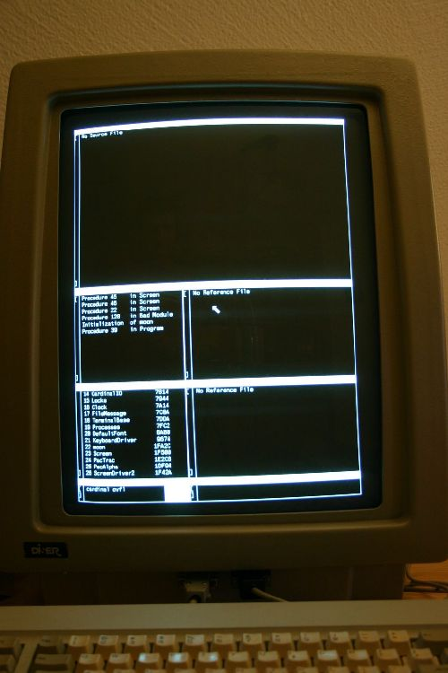 Alt...A photo of a vertical CRT display showing multiple windows, denoted as white frames, and a Pascal/Oberon style mouse cursor
